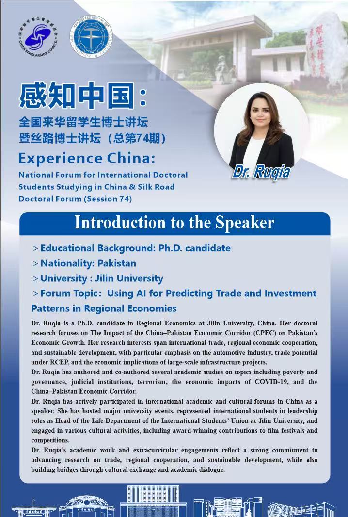 论坛围绕“AI赋能科学研究方法的变革”展开,设有学术汇报、平行研讨等环节,聚焦人工智能时代下的学科交叉与科研创新。在专题报告环节,Dr. Ruqia Ruqia博士作了题为“Using AI for Predicting Trade and Investment Patterns in Regional Economies (利用AI预测区域经济中的贸易与投资模式)”的学术汇报,重点探讨了人工智能在区域经济预测中的应用,并结合中巴经济走廊等案例,分析了AI模型在识别贸易流向与投资潜力方面的作用。与会期间,Dr. Ruqia与其他高校博士生围绕科研创新与学术发展等议题进行了深入交流。